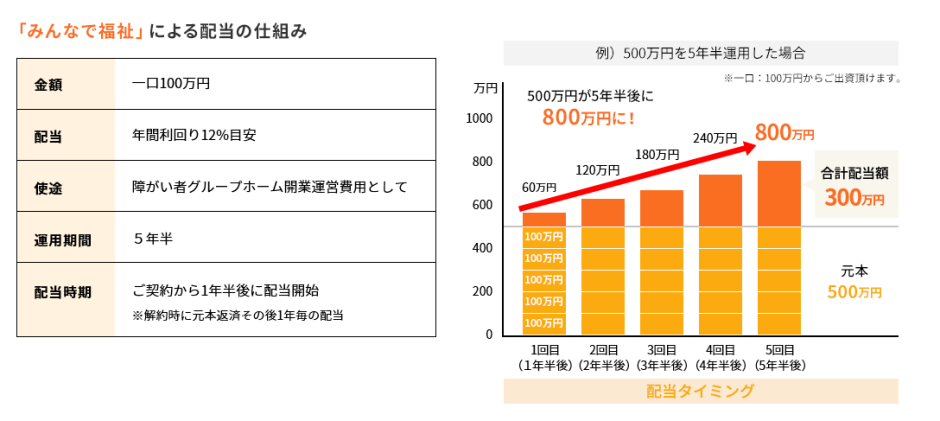 みんなで福祉は一口100万円で年利12%目安と非常に高配当です。 不動産事業としての実績と独自のスキームにより、グループホーム1棟あたりの入居率が70〜80%以上になることで年間12%の配当を実現させています。
