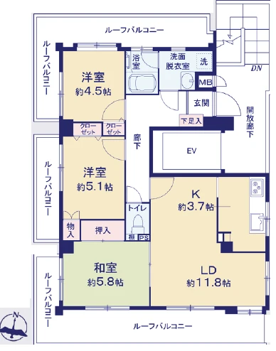 ・全室ルーフバルコニに面しており、通風良好。各居室に収納豊富な角部屋となっております。