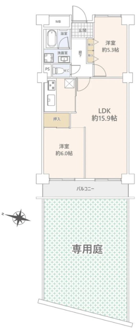 ・お部屋は1階部分の2LDKタイプ。専用庭付きでガーデニング等をお楽しみいただけます。