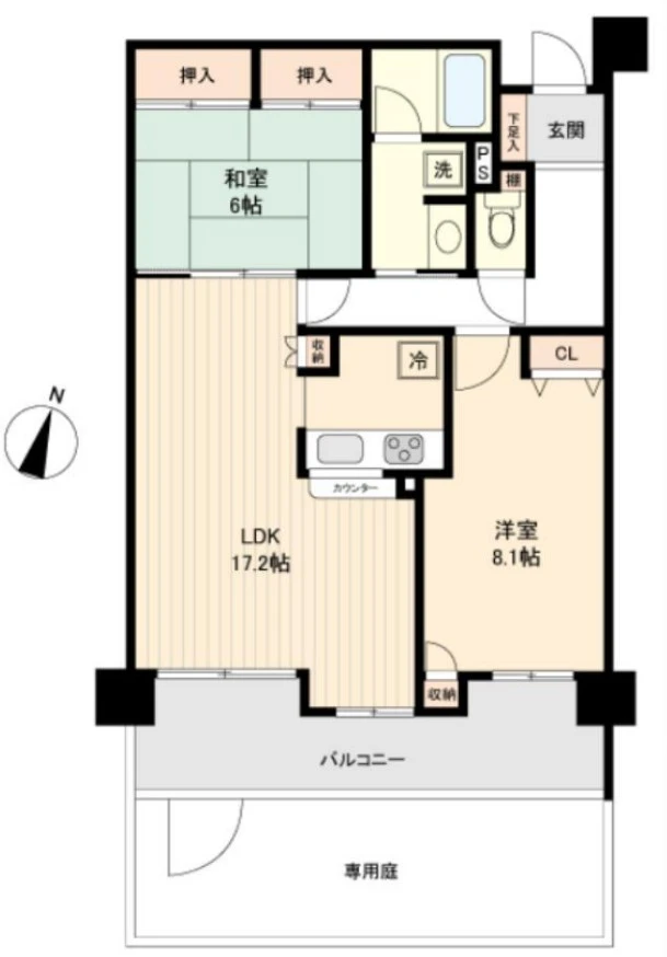 ・お部屋は1階部分、南東向きの2LDK。ガーデニングなどが楽しめる、戸建て感覚の専用庭付きです。