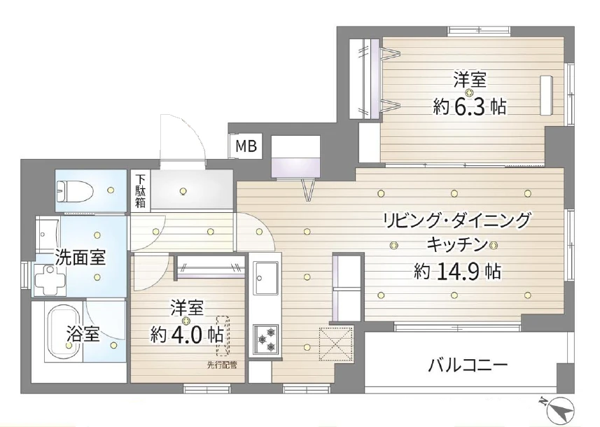 ・お部屋は4階部分の2LDKタイプ。南西向きバルコニーのため日当たり良好です。