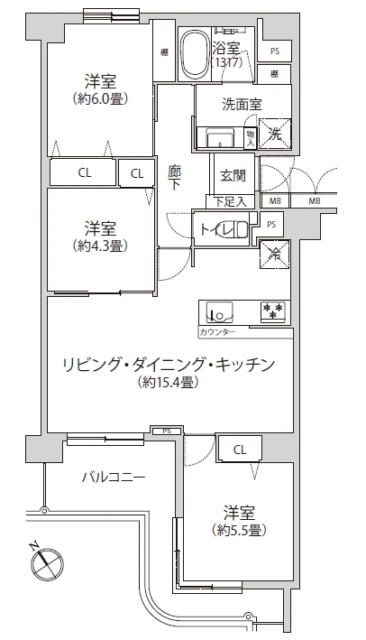 3LDK 57.20㎡ 1996年11月 4階 地上13階 東