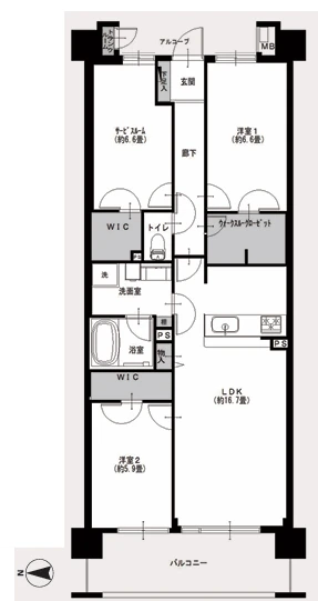 3LDK+WIC 80.70㎡ 2005年06月 9階 地上14階/地下1階 北東