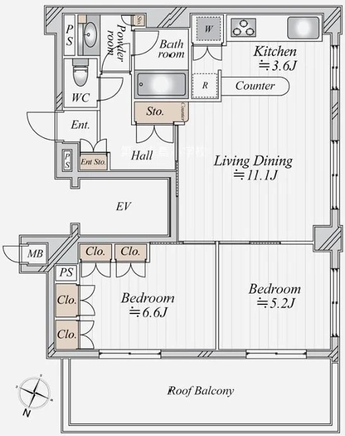 ・お部屋は7階部分の2LDKタイプ。見晴らしの良い開放感のあるルーフバルコニー付きです。