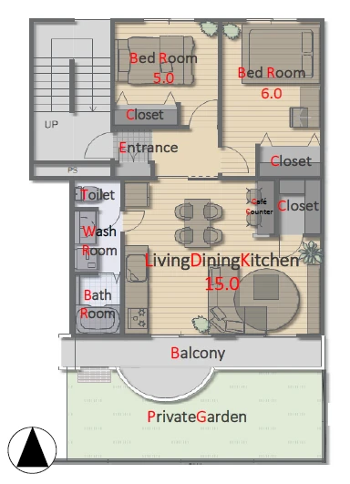 ・南向きの専用庭付き2LDK。陽当り良好で拘りの内装です。ディンクスにもお勧めの間取りです。