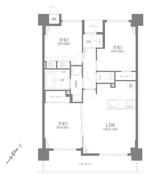 ・お部屋は5階部分の3LDKタイプ。各居室クローゼット完備でお部屋がスッキリ片付きます。