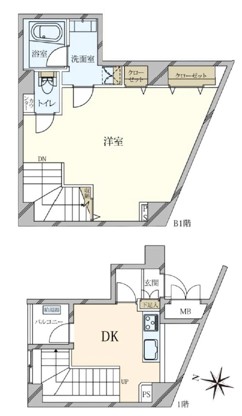 ・お部屋はB1~1階部分、メゾネットタイプの1DK。リノベーション済みにつき内装は新築同様です。